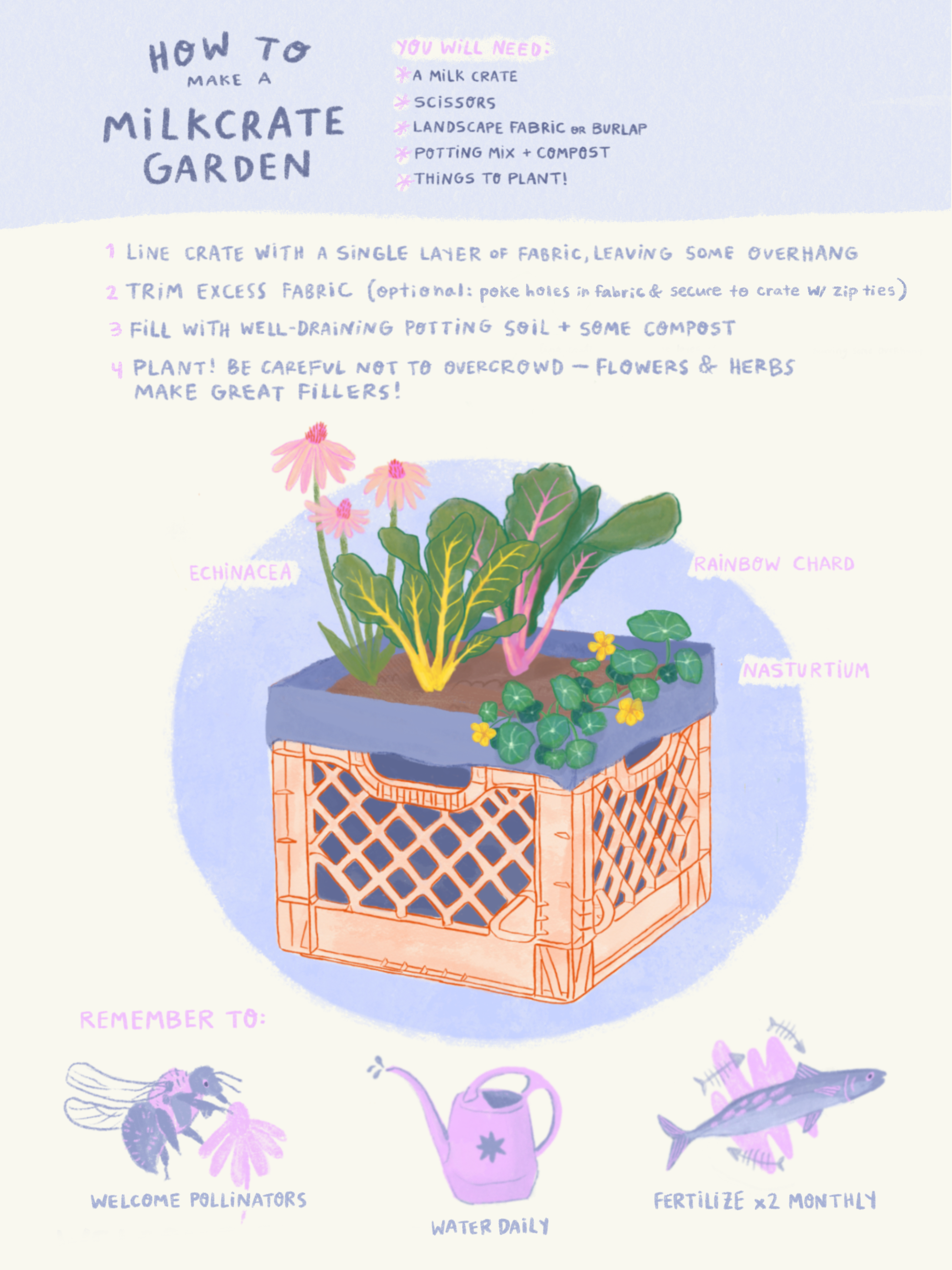 One of the rooftop farms I worked at used milk crates to maximize grow space and allow for modularity. I was inspired by this and chose to create an infographic detailing how to create a milk crate garden of your own.
